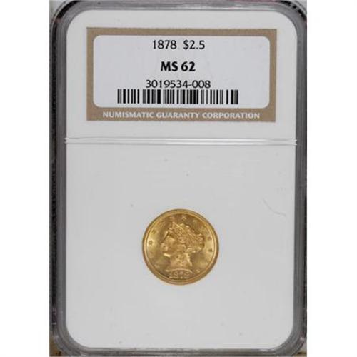 <B>1878 $2 1/2 MS62 NGC.</B></I> NGC Census: (406/364). PCGS Population (268/360). Mintage: 286,260. Numismedia Wsl. Price for NGC/PCGS coin in MS62: $470. (#7828)<BR><BR><b>Shipping:</b> Coins & Currency (<a target="_blank" href="http://www.heritageauctions.com/common/shipping.php">view shipping information</a>)