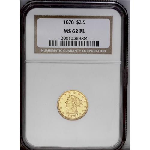 <B>1878<$2 1/2> MS62 Prooflike NGC.</B></I> Nicely struck with pleasing, reflective luster and few marks for the grade. Just three examples have been certified as Prooflike by NGC, and this piece is tied with one other as the finest known (9/06).