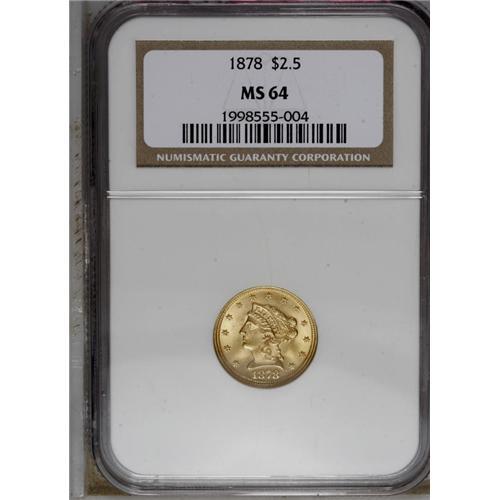 <B>1878<$2 1/2> MS64 NGC.</B></I> A satiny, mellow gold color. Well struck, with no serious distractions.