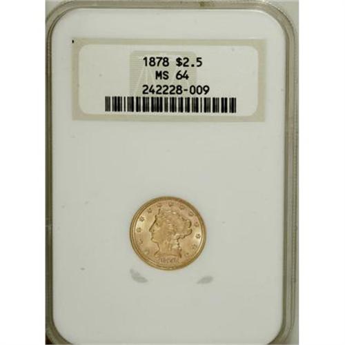 <B>1878 $2 1/2 MS64 NGC.</B></I> Boldly struck aside from star 1 and the eagle's left (facing) leg. Unblemished fields and fresh sun-gold luster confirm the certified grade. In a prior generation holder.<BR><BR><B>Coin Engraver:</B> Christian Gobrecht<BR><BR><b>Shipping:</b> Coins & Currency (<a target="_blank" href="http://www.heritageauctions.com/common/shipping.php">view shipping information</a>)