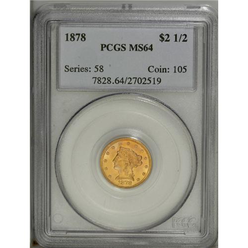 <B>1878 $2 1/2 MS64 PCGS.</B></I> A stunning example of this type coin. Deep rich luster with orange-yellow color cover this coin. The strike is full and accents all of the recessed areas. A candidate for a Choice type set.<BR><BR><b>Shipping:</b> Coin/Currency (<a target="_blank" href="http://www.heritageauctions.com/common/shipping.php">view shipping information</a>)