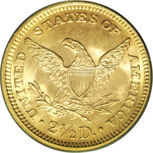 <B>1878<$2 1/2> MS65 PCGS.</B></I> This lovely Gem example offers apricot-gold surfaces on the obverse that deepen on the reverse to mellow sunset-orange. The strike is bold throughout, with full star centrils and no spots of significant weakness. Two small dark toning spots are noted, one near star 10, a second in the hair above Liberty's coronet. Population: 24 in 65, 4 finer (8/06).
