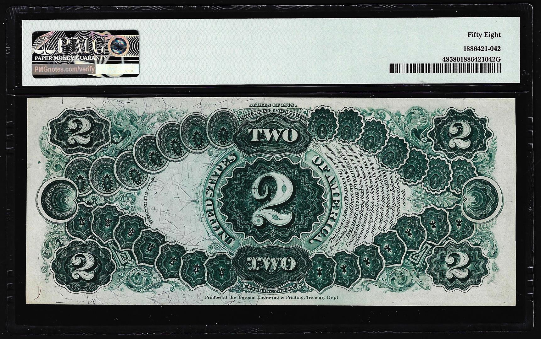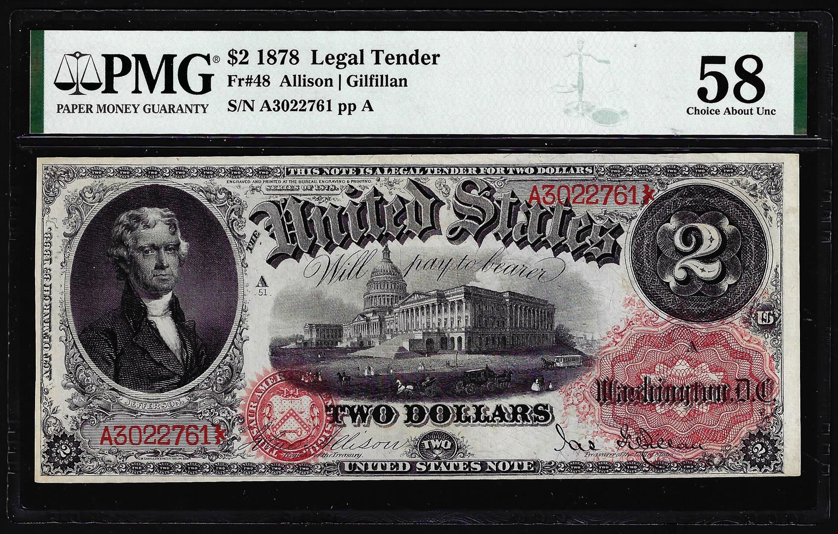 One 1878 $2 Legal Tender Note Fr.48 PMG Choice About Uncirculated 58. PMG Certified.