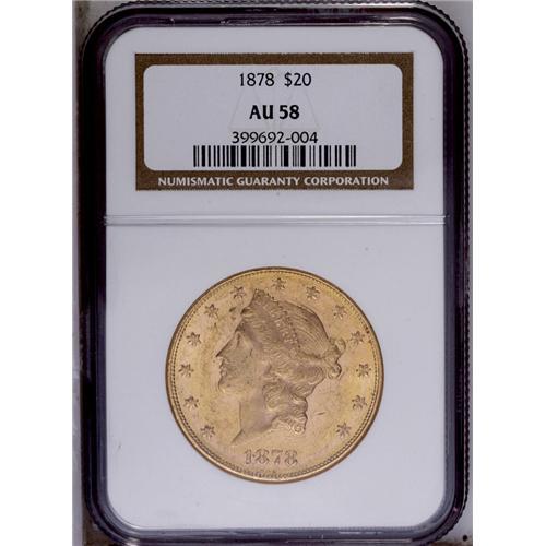 <B>1878<$20> AU58 NGC.</B></I> A semi-prooflike double eagle that has bright yellow-gold color and the expected number of individually minor abrasions. A couple of left side obverse stars lack full centrils, but the strike is generally crisp. <BR><BR><B>Important notice:</B> Heritage usually auctions material at the rate of 200-250 lots per hour. On some occasions eBay Live bid software or the Internet may not be able to keep up with the pace of the auction. We recommend placing a realistic absentee bid now as insurance to avoid disappointment. Occasionally the auctioneer may eliminate or reject an eBay Live bid, and the auctioneer may also reopen a lot after the close of the eBay live bidding (usually because we missed an audience bid), and may reject your bid even if it shows you as the winning bidder. By bidding via eBay Live, you agree that Heritage may award the lot to another bidder at its sole discretion under the circumstances described above or any other reasonable circumstances. Since eBay bids are not shown to us until we open the lot on the floor, we treat those bids just like floor bids. In most cases the floor responds before the eBay bid is presented to us, due to Internet lag time, so for consistency we have made it a policy that floor bids are always considered first over tie eBay live bids. Also please note that all Heritage lots purchased through eBay Live carry a 20% Buyer's Premium. Please make sure you read the Terms and Conditions before you bid. This lot is being auctioned in conjunction with a live floor auction by Heritage Galleries & Auctioneers. All final auction and invoice information will be supplied by Heritage Galleries & Auctioneers, and all other information should be considered preliminary. Lot:4273 <BR><BR><B>Winning Notification and Billing:</B> After the FINAL session in this auction is complete, Heritage will send e-mail and snail mail invoices. This process normally takes several days. All final auction and invoice information will be supplied by Heritage Galleries & Auctioneers, and all other information should be considered preliminary. <BR><BR>This auction will be conducted on a live auction floor and over the Internet through eBay Live. If you choose to place an absentee bid, please take a moment to <font color='#0000ff'><u><a href='http://pages.ebay.com/liveauctions/help/before/laabsentee.html'>learn how eBay Live absentee bidding works</a></u></font><font color='#000000'>