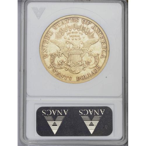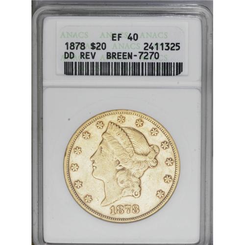 <B>1878<$20>--Doubled Die Reverse--XF40 ANACS.</B></I> Breen-7270. STATES OF is broadly die doubled toward the rim. Traces of luster cling to the recesses of this golden-brown double eagle. Only a few marks above the date merit mention.