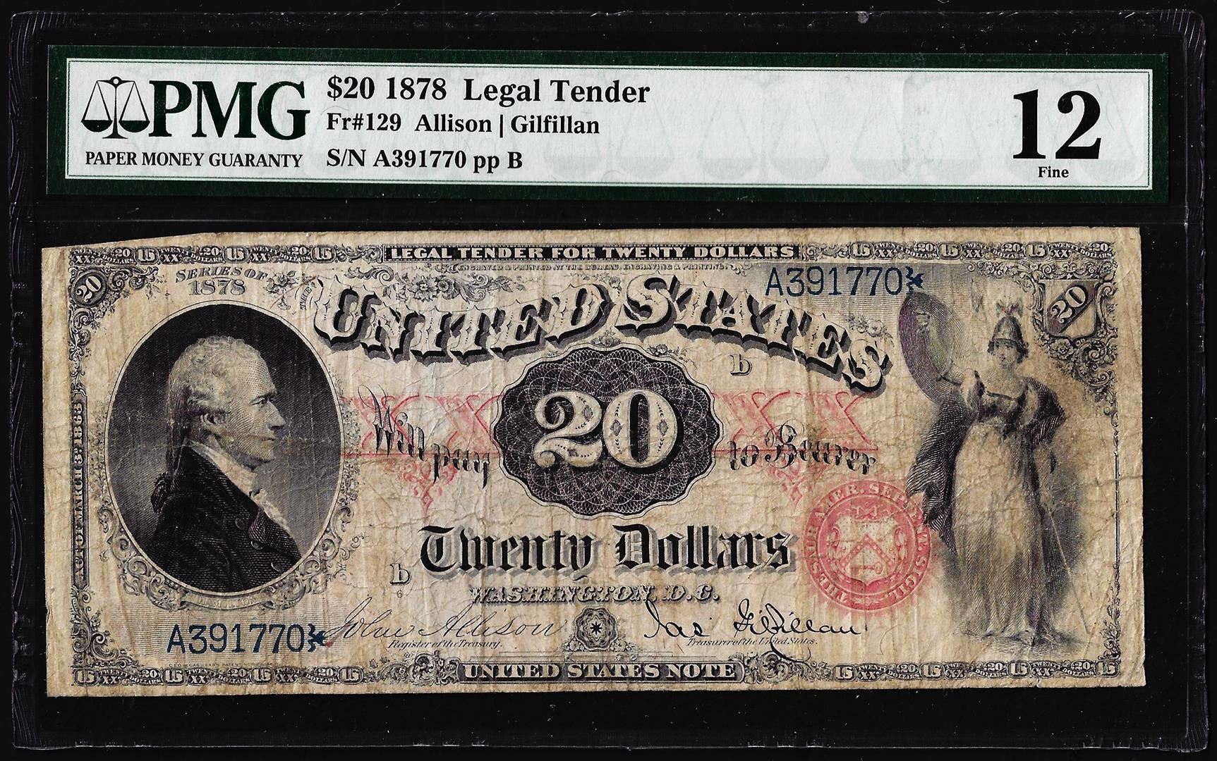 One 1878 $20 Legal Tender Note Fr.129 PMG Fine 12. PMG Certified.