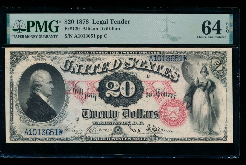One 1878 $20 Legal Tender Note PMG 64EPQ.