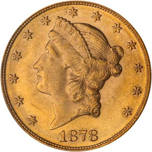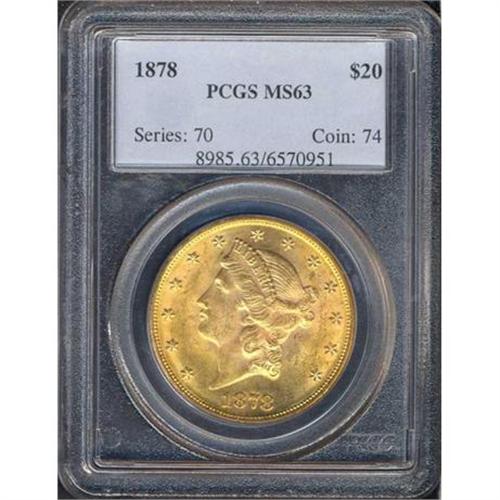 <b>1878 $20 Liberty. PCGS graded MS63.</b> Aesthetically tempting, as fine a looking MS63 of this slightly scarcer P-mint issue with full strike as you are apt to see, and all the while saturated with bright golden bloom, little in the way of toning <b>(PCGS # 8985)</b> <i>