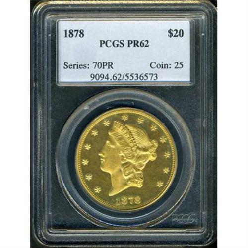 <b>1878 $20 Liberty. PCGS graded Proof 62.</b> Pop: 1/2. Here we meet with a conundrum -- a word popularized by a recently retired, slow-talking central banker -- with 20 minted in Proof, the marketplace would expect 1878 to receive the same deference and veneration that is given to the 1875 Proofs, but this isn't the case. While 1878 is like a sibling to 1875, it matters little to bidders who understand this year's great rarity. Therefore, when bidding begins to move forward, take notice and place your bid. Both sides of the coin display an exceptional frosty device with dazzling mirror brilliance, being predominately yellow-gold to brownish amber plus maybe a touch of reddish color from the copper alloy in the metal. Sharp-edged devices and lettering throughout, this being a lock-solid Proof 62. PCGS serial #5536573.