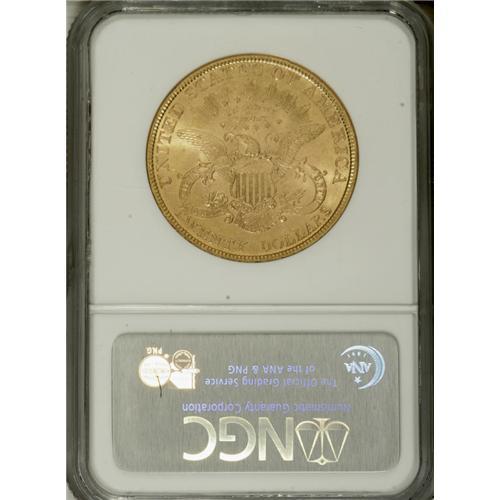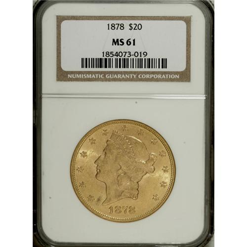 <B>1878 $20 MS61 NGC.</B></I> Breen-7270. UNITED STATES OF AMERICA is moderately die doubled, and the final 8 in the date is repunched. A lustrous and boldly struck example with distributed obverse marks.<BR><BR><b>Shipping:</b> Coins & Currency (<a target="_blank" href="http://www.heritageauctions.com/common/shipping.php">view shipping information</a>)