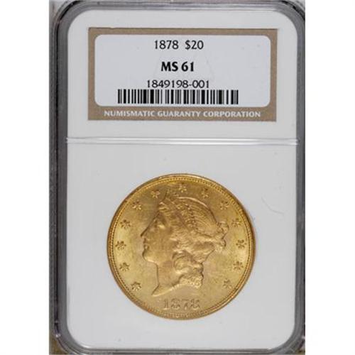 <B>1878 $20 MS61 NGC.</B></I> A semi-prooflike Liberty twenty with lustrous fields and devices. The strike is sharp, and the scattered small marks on both sides are appropriate for the grade.<BR><BR><b>Shipping:</b> Coins & Currency (<a target="_blank" href="http://www.heritageauctions.com/common/shipping.php">view shipping information</a>)