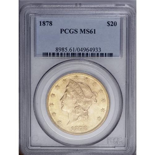 1878 $20 MS61 PCGS. Bright, attractive peach-gold surf