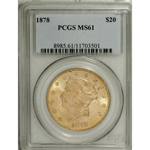 <B>1878 $20 MS61 PCGS.</B></I> This crisply struck P-mint double eagle has vibrantly lustrous yellow-gold surfaces that show subtle pink and green accents. While the reverse is comparatively clean, the obverse shows myriad grade-defining marks and a handful of more significant abrasions near the date.<BR><BR><B>Coin Engraver:</B> James B. Longacre<BR><BR><b>Shipping:</b> Coins & Currency (<a target="_blank" href="http://www.heritageauctions.com/common/shipping.php">view shipping information</a>)