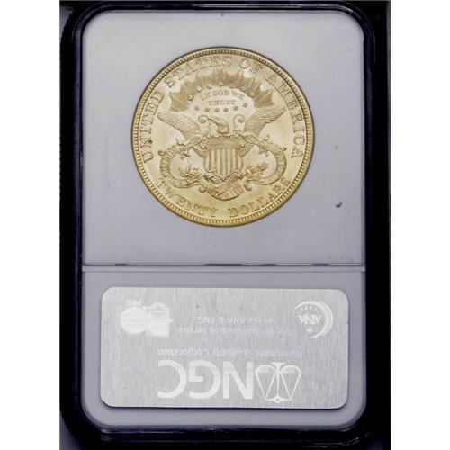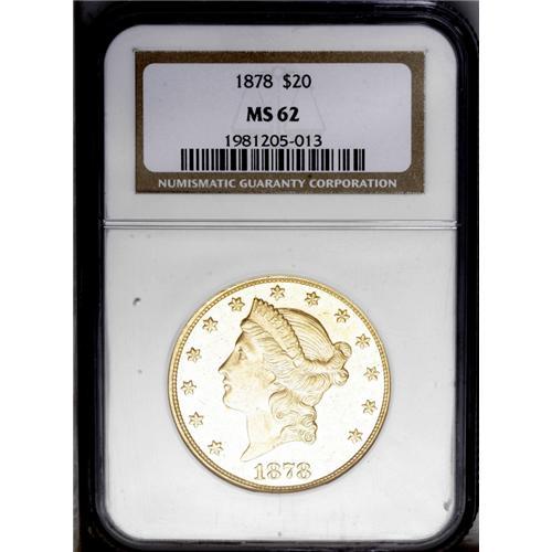 <B>1878<$20> MS62 NGC.</B></I> Breen-7270. The reverse is die tripled, most evident on the peripheral legends. In addition, the obverse is decidedly prooflike, and aside from a single pinscratch on the cheek, the surfaces are clean for the assigned grade. <BR><BR><B>Important notice:</B> Heritage usually auctions material at the rate of 200-250 lots per hour. On some occasions eBay Live bid software or the Internet may not be able to keep up with the pace of the auction. We recommend placing a realistic absentee bid now as insurance to avoid disappointment. Occasionally the auctioneer may eliminate or reject an eBay Live bid, and the auctioneer may also reopen a lot after the close of the eBay live bidding (usually because we missed an audience bid), and may reject your bid even if it shows you as the winning bidder. By bidding via eBay Live, you agree that Heritage may award the lot to another bidder at its sole discretion under the circumstances described above or any other reasonable circumstances. Since eBay bids are not shown to us until we open the lot on the floor, we treat those bids just like floor bids. In most cases the floor responds before the eBay bid is presented to us, due to Internet lag time, so for consistency we have made it a policy that floor bids are always considered first over tie eBay live bids. Also please note that all Heritage lots purchased through eBay Live carry a 20% Buyer's Premium. Please make sure you read the Terms and Conditions before you bid. This lot is being auctioned in conjunction with a live floor auction by Heritage Galleries & Auctioneers. All final auction and invoice information will be supplied by Heritage Galleries & Auctioneers, and all other information should be considered preliminary. Lot:4274 <BR><BR><B>Winning Notification and Billing:</B> After the FINAL session in this auction is complete, Heritage will send e-mail and snail mail invoices. This process normally takes several days. All final auction and invoice information will be supplied by Heritage Galleries & Auctioneers, and all other information should be considered preliminary. <BR><BR>This auction will be conducted on a live auction floor and over the Internet through eBay Live. If you choose to place an absentee bid, please take a moment to <font color='#0000ff'><u><a href='http://pages.ebay.com/liveauctions/help/before/laabsentee.html'>learn how eBay Live absentee bidding works</a></u></font><font color='#000000'>
