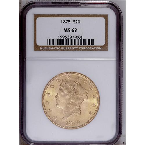 1878 $20 MS62 NGC. Bright, lustrous surfaces exhibit p 1878[$20] MS62 NGC.