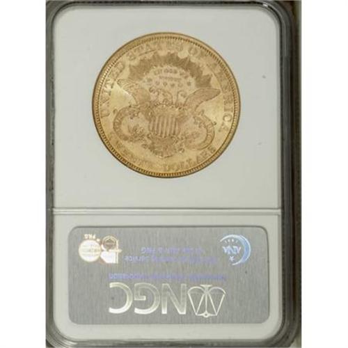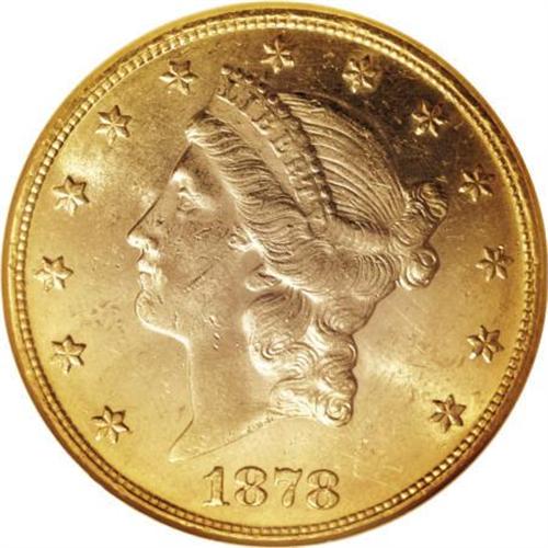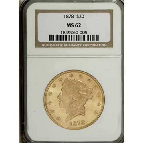 <B>1878 $20 MS62 NGC.</B></I> Because of later repatriations, this issue is available in grades up through MS61. MS62 pieces are more elusive, however. The present piece displays moderate abrasions consistent with the grade, with a sharp strike and premium appearance overall. PCGS has certified only 31 coins finer (7/07).<BR><BR><B>Coin Engraver:</B> James B. Longacre<BR><BR><b>Shipping:</b> Coins & Currency (<a target="_blank" href="http://www.heritageauctions.com/common/shipping.php">view shipping information</a>\)
