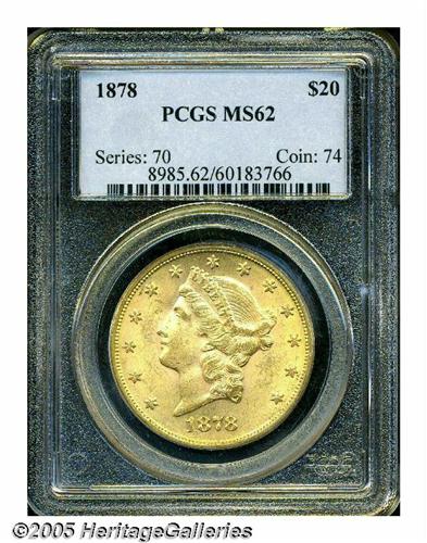 <B>1878<$20> MS62 PCGS.</B></I> Highly attractive with brilliant yellow-gold luster and hints of pink toning. Deeper honey-gold color appears on the reverse. PCGS has only certified 26 finer examples of this condition rarity.