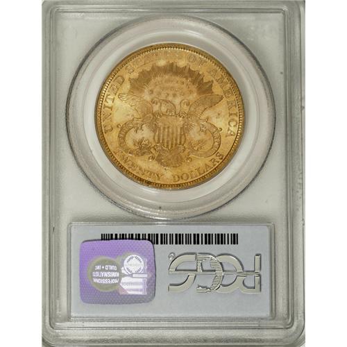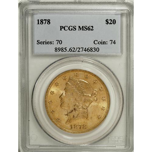 <B>1878 $20 MS62 PCGS.</B></I> Richly colored in yellow and orange-gold, with substantial luster, and great definition on the design elements. An even distribution of small marks is noted on the obverse. An obverse copper-streak is noted across Liberty's neck. An overall flashy appearance.<BR><BR><b>Shipping:</b> Coins & Currency (<a target="_blank" href="http://www.heritageauctions.com/common/shipping.php">view shipping information</a>)
