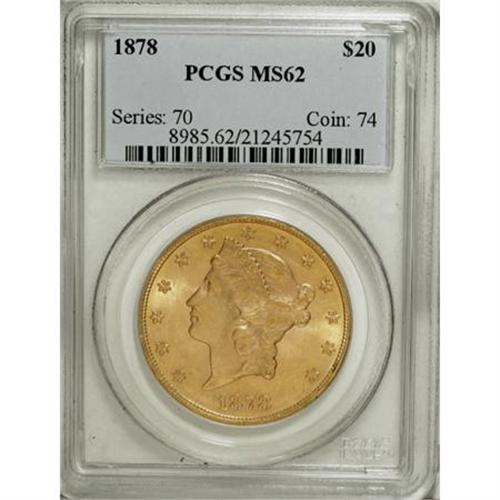 <B>1878 $20 MS62 PCGS.</B></I> Flashy with cartwheel luster and hints of pink against the yellow-gold surfaces. While the surfaces show some wispy flaws, the overall eye appeal is struck for this Philadelphia issue. PCGS has graded 32 finer examples (11/07).<BR><BR><B>Coin Engraver:</B> James B. Longacre<BR><BR><b>Shipping:</b> Coins & Currency (<a target="_blank" href="http://www.heritageauctions.com/common/shipping.php">view shipping information</a>)