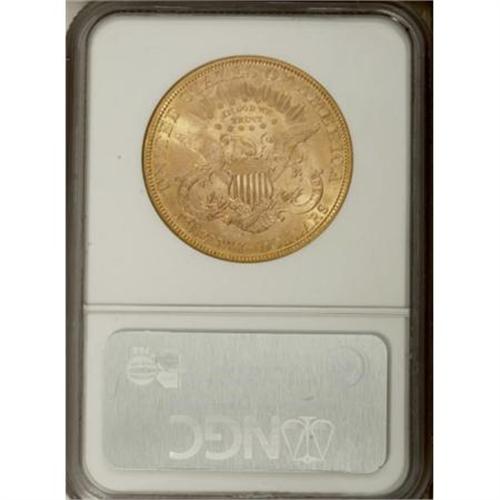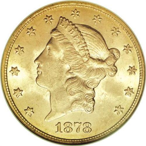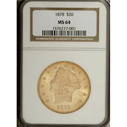 <B>1878 $20 MS64 NGC.</B></I> Though this early Type Three issue is readily available through higher circulated and even lower Mint State grades, the challenge rises rapidly as one ascends the Mint State scale. Garrett and Guth (2006) describe the population as " ... heavily weighted to the MS60 and MS61 grades. Choice examples are scarce, and the date is unknown in [G]em condition."<BR> On this near-Gem survivor, the obverse offers a wonderfully frosty appearance, while the reverse showcases more straightforward brilliance. The fields are primarily wheat-gold with whispers of peach and green at the margins. Though light luster grazes and marks appear around the devices, the portrait is surprisingly clean, and the overall visual appeal is impressive. Tied for the finest certified by either NGC or PCGS (12/07).<BR><BR><B>Coin Engraver:</B> James B. Longacre<BR><BR><b>Shipping:</b> Coins & Currency (<a target="_blank" href="http://www.heritageauctions.com/common/shipping.php">view shipping information</a>)