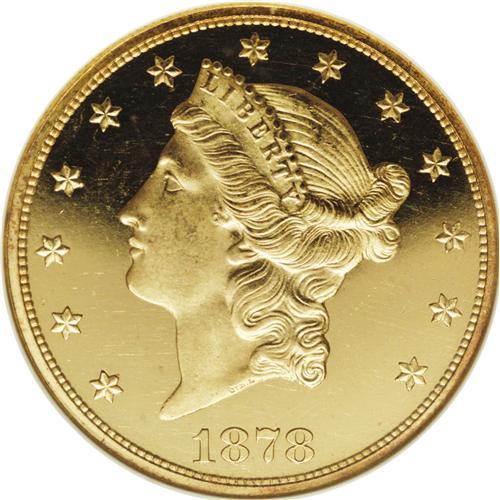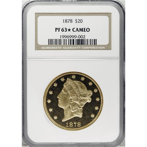 <B>1878 $20 PR63 <img border='0' src='http://www.heritagecoins.com/images/star.gif' width=10 height=10> Cameo NGC.</B></I> In all grades and all designations, PCGS and NGC have combined to grade just 14 proof 1878 double eagles, from a total mintage of just 20 coins. It is probably reasonable to estimate a true population of less than 10 coins for this issue. We are aware of examples in the Smithsonian Institution and the American Numismatic Society. In addition to these, both the Garrett and Eliasberg Collections included examples, and another was in the F.C.C. Boyd Collection. One additional example appeared in the Bass Collection, acquired from Stack's in 1973. The Bass specimen may or may not be the same as the Boyd example. Most others that have appeared in auctions over the past 25 years are probably duplicates of the privately held coins discussed above.<BR> This is an impressive Cameo proof with extraordinary eye appeal. The central obverse and reverse designs are executed in bright yellow-gold with fully mirrored fields. Darker yellow color is limited to the border on each side, and this serves as a nice frame for the balance of the coin. The surfaces exhibit a few faint hairlines, thus the limited numerical grade, yet few blemishes are of any significance. The most notable pedigree marker is a small field nick just over the rays below D of UNITED. All of the design elements on each side are fully impressed. A visual treat. Census: 1 in 63, 2 finer (11/06).<BR><BR><b>Shipping:</b> Coin/Currency (<a target="_blank" href="http://www.heritageauctions.com/common/shipping.php">view shipping information</a>)