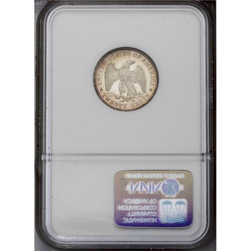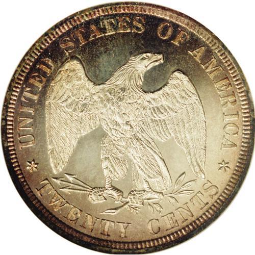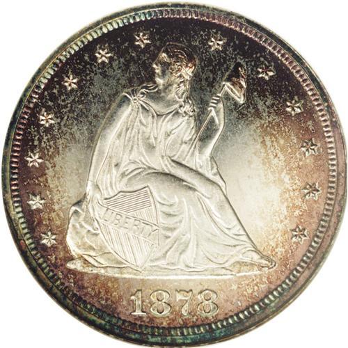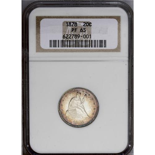 <B>1878<20C> PR63 NGC.</B></I> A mere 600 pieces constitute the mintage of this proof-only date, which ended production of the short-lived twenty cent denomination. LIBERTY was raised rather than incuse, and the eagle faced right instead of left. But these design differences were insufficient to prevent confusion with the similar-sized quarter dollar, which doomed the denomination. This well struck specimen has lovely peripheral ruby-red and honey shades, while the centers are untoned. The devices display undesignated cameo contrast.<BR><I>From The Frank DuVall Collection.</B></I>