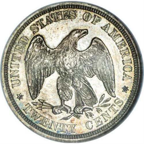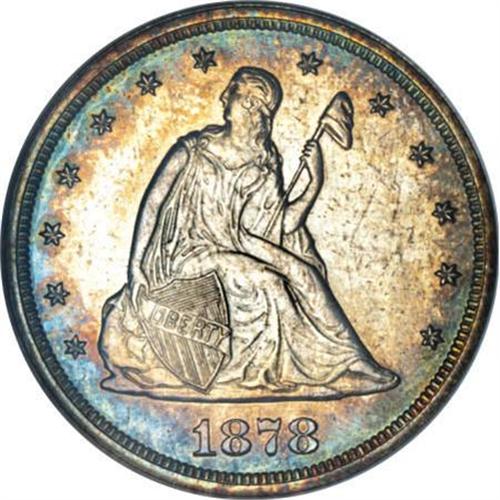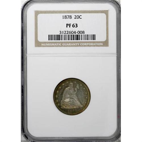 <B>1878 20C PR63 NGC.</B></I> The final year of the denomination, and a proof-only issue with just 600 pieces coined. The short-lived 20-cent denomination was only coin in 1875 and 1876, yet includes an important series of pattern coins, the regular issue coins, the proof-only pieces, and the 1876-CC rarity. This delightful piece has vibrant gold, russet, and blue toning on the obverse, with faint reverse toning that is similar. <BR><I>From The John Stimson, Sr. Collection, Part Two.</B></I><BR><BR><B>Coin Engraver:</B> William Barber<BR><BR><b>Shipping:</b> Coins & Currency (<a target="_blank" href="http://www.heritageauctions.com/common/shipping.php">view shipping information</a>)