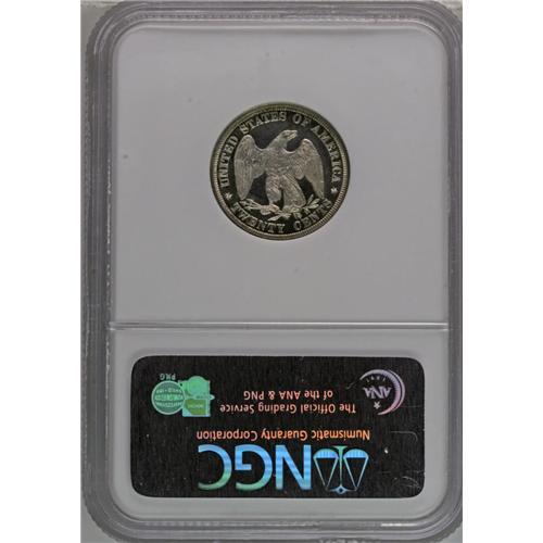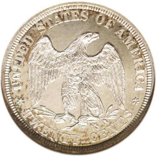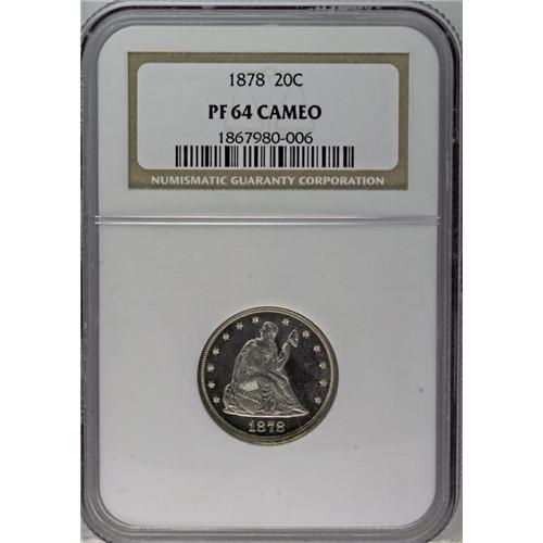 <B>1878<20C> PR64 Cameo NGC.</B></I> The final issue of the twenty cent denomination was produced to appease collectors' appetites for these coins, and 600 were sold in proof sets during the year, representing the total mintage of this date. Although there were enough differences to tell them apart, there coins were similar to quarter dollars and too easily confused. The obverse has LIBERTY raised, rather than incuse on the quarters. The stars are much smaller and more widely spaced. On the reverse, there is no motto above the eagle, and its head is turned to the right instead of the left. The olive branch and arrows are also reversed, with the arrows grasped by the dexter claw.