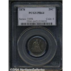 <B>1878<20C> PR64 PCGS.</B></I> Well mirrored beneath mottled sea-green, violet, and burnt-gold toning. A mere 600 proofs were struck of this final year Twenty Cent issue. <BR><BR><B>Important notice:</B> Heritage usually auctions material at the rate of 200-250 lots per hour. On some occasions eBay Live bid software or the Internet may not be able to keep up with the pace of the auction. We recommend placing a realistic absentee bid now as insurance to avoid disappointment. Occasionally the auctioneer may eliminate or reject an eBay Live bid, and the auctioneer may also reopen a lot after the close of the eBay live bidding (usually because we missed an audience bid), and may reject your bid even if it shows you as the winning bidder. By bidding via eBay Live, you agree that Heritage may award the lot to another bidder at its sole discretion under the circumstances described above or any other reasonable circumstances. Since eBay bids are not shown to us until we open the lot on the floor, we treat those bids just like floor bids. In most cases the floor responds before the eBay bid is presented to us, due to Internet lag time, so for consistency we have made it a policy that floor bids are always considered first over tie eBay live bids. Also please note that all Heritage lots purchased through eBay Live carry a 20% Buyer's Premium. Please make sure you read the Terms and Conditions before you bid.