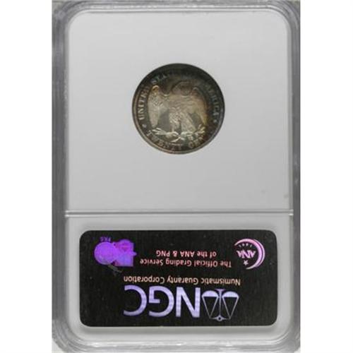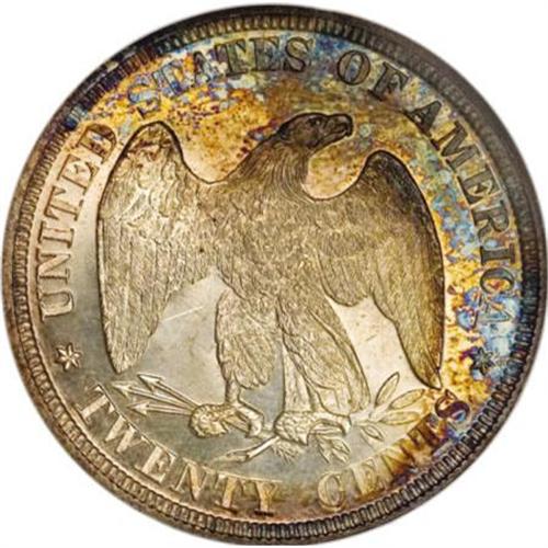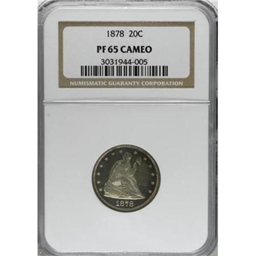 <B>1878 20C PR65 Cameo NGC.</B></I> While the 2008 <I>Guide Book</B></I> reports the 1878 twenty cent proof-only mintage being 600 pieces, Walter Breen, in his <I>Encyclopedia of United States and Colonial Proof Coins</B></I>, speculates that: "... about 500 1878's might have been issued--possibly a few less." Regardless of the mintage, certified population figures would indicate that relatively few coins survived with full Cameos. <BR> This Gem Cameo displays pronounced field-motif contrast, and is exquisitely struck throughout. Sprinkles of golden-tan patination concentrate at the obverse borders, while the reverse takes on splotches of medium intensity cobalt-blue, lavender, and golden-brown color in the upper and right fields. A few wispy marks in the fields appear under magnification, but are not at all distracting. Census: 11 in 65 Cameo, 7 finer (6/07).<BR><BR><b>Shipping:</b> Coins & Currency (<a target="_blank" href="http://www.heritageauctions.com/common/shipping.php">view shipping information</a>\)