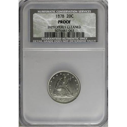 <B>1878 20C --Improperly Cleaned--NCS. Proof.</B></I> The brief four-year run of the twenty cent piece ensures that any proof is desirable as a type coin. But the series ended with two low mintage proof-only dates, which makes these particularly in demand. For the 1878, only 600 proofs were struck. The present specimen is well struck and has light pearl-gray toning. The fields are subdued but only faintly hairlined.<BR><BR><B>Coin Engraver:</B> William Barber<BR><BR><b>Shipping:</b> Coins & Currency (<a target="_blank" href="http://www.heritageauctions.com/common/shipping.php">view shipping information</a>)