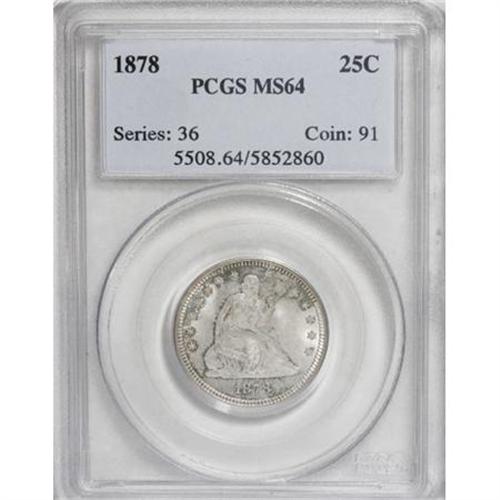 <B>1878 25C MS64 PCGS.</B></I> Both sides are originally toned in mottled sea-green and turquoise shades that appear chiefly near the border on the obverse. The 1878 is a scarce Seated Quarter issue despite a mintage of 2.2 million pieces, most of which were probably melted to provide silver bullion for Morgan dollar production. Population: 19 in 64, 14 finer (6/07). <BR><BR><b>Shipping:</b> Coins & Currency (<a target="_blank" href="http://www.heritageauctions.com/common/shipping.php">view shipping information</a>)