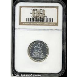 1878 25C PR64 Cameo NGC. Untoned with glassy refle <B>1878 25C PR64 Cameo NGC.</B></I> Untoned with glassy reflective qualities and a fair degree of contrast. An instantly appealing Proof Seated Quarter and a difficult issue with a Cameo designation. <BR><BR><B>Important notice:</B> Heritage usually auctions material at the rate of 200-250 lots per hour. On some occasions eBay Live bid software or the Internet may not be able to keep up with the pace of the auction. We recommend placing a realistic absentee bid now as insurance to avoid disappointment. Occasionally the auctioneer may eliminate or reject an eBay Live bid, and the auctioneer may also reopen a lot after the close of the eBay live bidding (usually because we missed an audience bid), and may reject your bid even if it shows you as the winning bidder. By bidding via eBay Live, you agree that Heritage may award the lot to another bidder at its sole discretion under the circumstances described above or any other reasonable circumstances. Since eBay bids are not shown to us until we open the lot on the floor, we treat those bids just like floor bids. In most cases the floor responds before the eBay bid is presented to us, due to Internet lag time, so for consistency we have made it a policy that floor bids are always considered first over tie eBay live bids. Also please note that all Heritage lots purchased through eBay Live carry a 20% Buyer's Premium. Please make sure you read the Terms and Conditions before you bid. This lot is being auctioned in conjunction with a live floor auction by Heritage Galleries & Auctioneers. All final auction and invoice information will be supplied by Heritage Galleries & Auctioneers, and all other information should be considered preliminary. Lot:5898