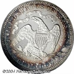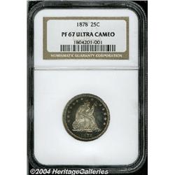 <B>1878<25C> PR67 Deep Cameo NGC.</B></I> Briggs 4-D. If this sharply struck coin is indicative of the issue, we cannot understand why Briggs (1991) states that the proof 1878 Quarter was "very sloppily made." This coin is <I>not</B></I> indicative of the issue in that the surfaces are exceptionally smooth with nary a distracting hairline to report. Rich gunmetal-blue and antique-copper surrounds the peripheral areas of each side, the centers are brilliant. Fully struck with diagnostic rust lumps (as struck) throughout the reverse shield and no singularly mentionable identifiers. This is the finest known 1878 Quarter with a Deep Cameo designation (9/04). <BR><BR><B>Important notice:</B> Heritage usually auctions material at the rate of 200-250 lots per hour. On some occasions eBay Live bid software or the Internet may not be able to keep up with the pace of the auction. We recommend placing a realistic absentee bid now as insurance to avoid disappointment. Occasionally the auctioneer may eliminate or reject an eBay Live bid, and the auctioneer may also reopen a lot after the close of the eBay live bidding (usually because we missed an audience bid), and may reject your bid even if it shows you as the winning bidder. By bidding via eBay Live, you agree that Heritage may award the lot to another bidder at its sole discretion under the circumstances described above or any other reasonable circumstances. Since eBay bids are not shown to us until we open the lot on the floor, we treat those bids just like floor bids. In most cases the floor responds before the eBay bid is presented to us, due to Internet lag time, so for consistency we have made it a policy that floor bids are always considered first over tie eBay live bids. Also please note that all Heritage lots purchased through eBay Live carry a 20% Buyer's Premium. Please make sure you read the Terms and Conditions before you bid.