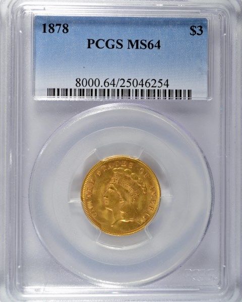 1878 $3.00 GOLD PCGS MS64, SURELY LOOKS LIKE MS65, DONT COME ANY NICER!