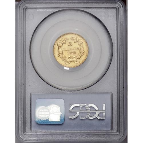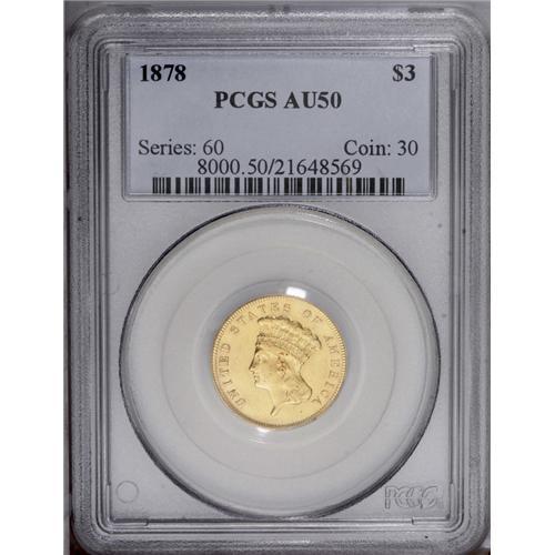 1878 $3 AU50 PCGS. Luster bathes protected areas, and 1878[$3] AU50 PCGS.