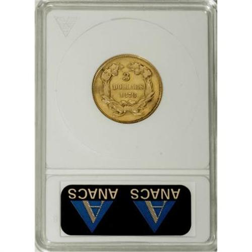 <B>1878 $3 --Ex-Jewelry--ANACS. AU53 Details.</B></I> NGC Census: (83/4167). PCGS Population (130/4188). Mintage: 82,324. Numismedia Wsl. Price for NGC/PCGS coin in AU53: $1,325. (#8000)<BR><BR><B>Coin Engraver:</B> James B. Longacre<BR><BR><b>Shipping:</b> Coins & Currency (<a target="_blank" href="http://www.heritageauctions.com/common/shipping.php">view shipping information</a>)