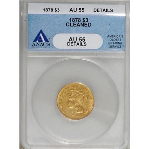 <B>1878 $3 --Cleaned--ANACS. AU55 Details.</B></I> NGC Census: (259/3919). PCGS Population (458/3810). Mintage: 82,324. Numismedia Wsl. Price for NGC/PCGS coin in AU55: $1,650. (#8000)<BR><BR><B>Coin Engraver:</B> James B. Longacre<BR><BR><b>Shipping:</b> Coins & Currency (<a target="_blank" href="http://www.heritageauctions.com/common/shipping.php">view shipping information</a>)