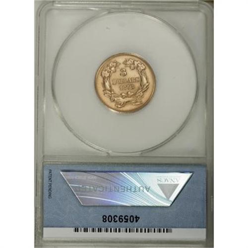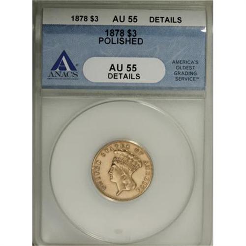 <B>1878 $3 --Polished--ANACS.</B></I> <B>AU55 Details.</B></I> NGC Census: (265/4012). PCGS Population (467/3865). Mintage: 82,324. Numismedia Wsl. Price for NGC/PCGS coin in AU55: $1,860. (#8000)<BR><BR><B>Coin Engraver:</B> James B. Longacre<BR><BR><b>Shipping:</b> Coins & Currency (<a target="_blank" href="http://www.heritageauctions.com/common/shipping.php">view shipping information</a>)