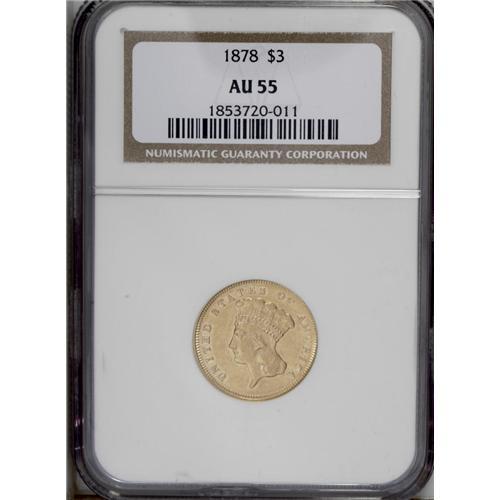 <B>1878 $3 AU55 NGC.</B></I> Along with the 1854, this is one of the most popular type issues for this series. A nicely struck yellow-orange piece that has a touch of wear and plenty of original luster.<BR><BR><b>Shipping:</b> Coin/Currency (<a target="_blank" href="http://www.heritageauctions.com/common/shipping.php">view shipping information</a>)