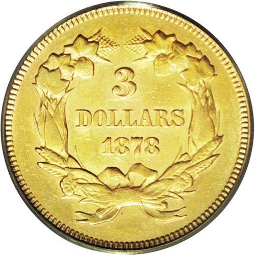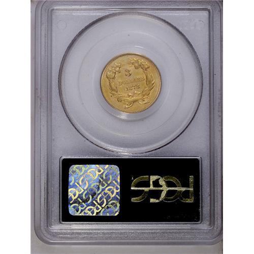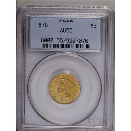 <B>1878<$3> AU55 PCGS.</B></I> Peach-tinged luster illuminates the legends and outlines the devices. The lime fields are lightly abraded save for a short pinscratch above the A in DOLLARS. The reverse shows die doubling on the ARS in DOLLARS and on the upper right portion of the wreath. Encapsulated in a former generation holder.