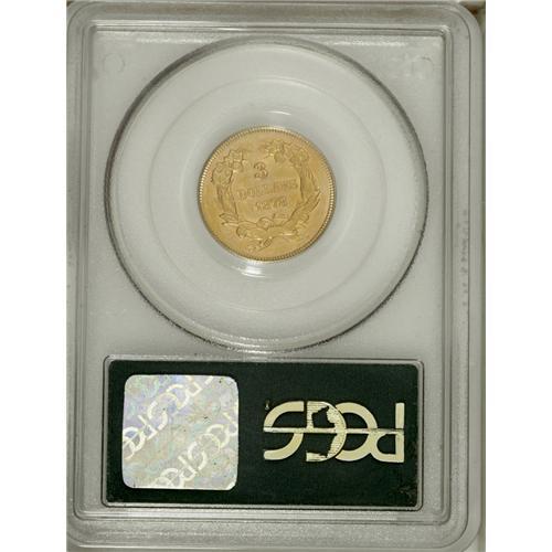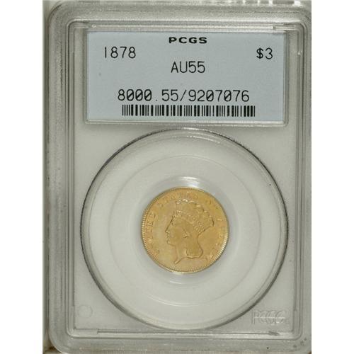 <B>1878 $3 AU55 PCGS.</B></I> Peach-tinged luster illuminates the legends and outlines the devices. The lime fields are lightly abraded save for a short pinscratch above the A in DOLLARS. The reverse shows die doubling on the ARS in DOLLARS and on the upper right portion of the wreath.<BR><BR><b>Shipping:</b> Coin/Currency (<a target="_blank" href="http://www.heritageauctions.com/common/shipping.php">view shipping information</a>)