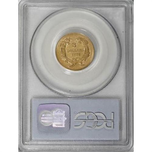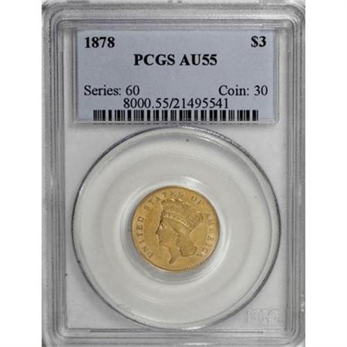 <B>1878 $3 AU55 PCGS.</B></I> The grade is discounted slightly due to a few faint hairlines on each side. Only the slightest wear visits the highpoints. Both sides have nearly full satin luster with light yellow color.<BR><BR><b>Shipping:</b> Coins & Currency (<a target="_blank" href="http://www.heritageauctions.com/common/shipping.php">view shipping information</a>)