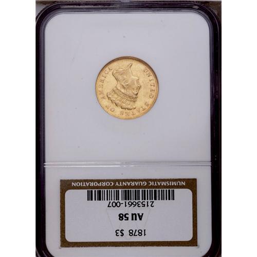 <B>1878<$3> AU58 NGC.</B></I> Bright peach-gold surfaces display traces of luster in the recessed areas, and exhibit sharply defined motifs. A few minute contact marks are noted on each side, and close inspection with a loupe reveals a mix of hairlines and die striations.