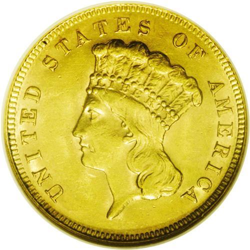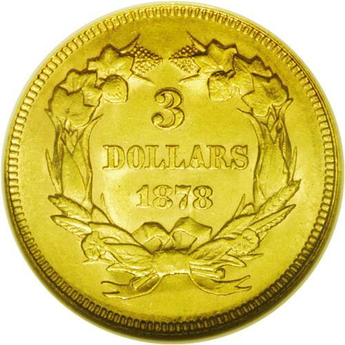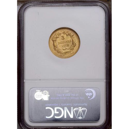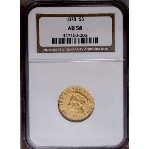 <B>1878<$3> AU58 NGC.</B></I> The design elements are generally well struck, save for touches of softness in portions of Liberty's hair. Ample luster remains on the somewhat subdued yellow-gold surfaces that are remarkably clean, save for several small marks on Liberty's chin. A very appealing three dollar gold piece.