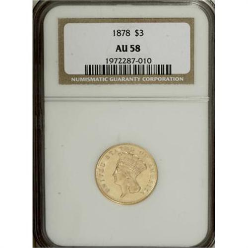 <B>1878 $3 AU58 NGC.</B></I> Shimmering luster dominates all but the cheek and open fields. A charming gold type coin with only a few obverse field marks. The reverse is lightly die doubled, most visible on the cotton leaves near 1 o'clock.<BR><BR><B>Coin Engraver:</B> James B. Longacre<BR><BR><b>Shipping:</b> Coins & Currency (<a target="_blank" href="http://www.heritageauctions.com/common/shipping.php">view shipping information</a>\)