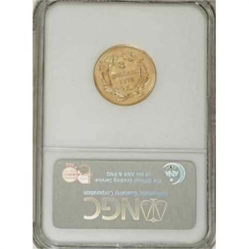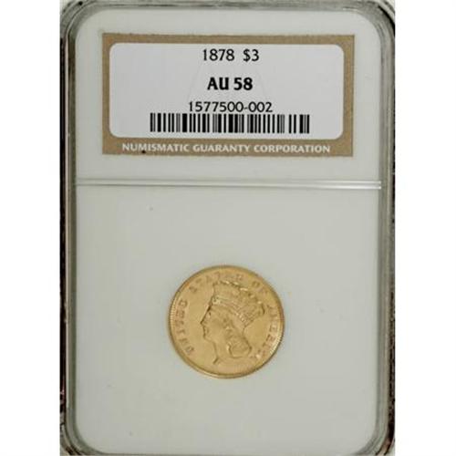 <B>1878 $3 AU58 NGC.</B></I> This straw-gold piece has virtually intact luster, though the highpoints of the well struck devices show light but distinct friction. A minimally marked and enticing example of this odd-denomination type issue.<BR><BR><B>Coin Engraver:</B> James B. Longacre<BR><BR><b>Shipping:</b> Coins & Currency (<a target="_blank" href="http://www.heritageauctions.com/common/shipping.php">view shipping information</a>)