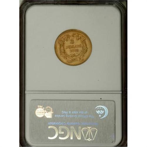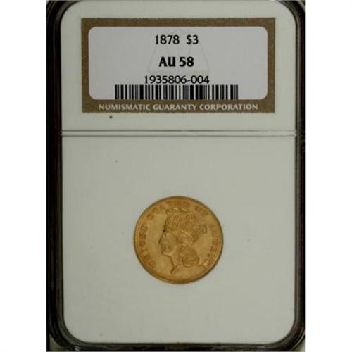<B>1878 $3 AU58 NGC.</B></I> Just a hint of highpoint friction is evident on this briefly circulated butter-yellow type coin. Ample satiny luster remains on the otherwise well-preserved surfaces.<BR><BR><B>Coin Engraver:</B> James B. Longacre<BR><BR><b>Shipping:</b> Coins & Currency (<a target="_blank" href="http://www.heritageauctions.com/common/shipping.php">view shipping information</a>)