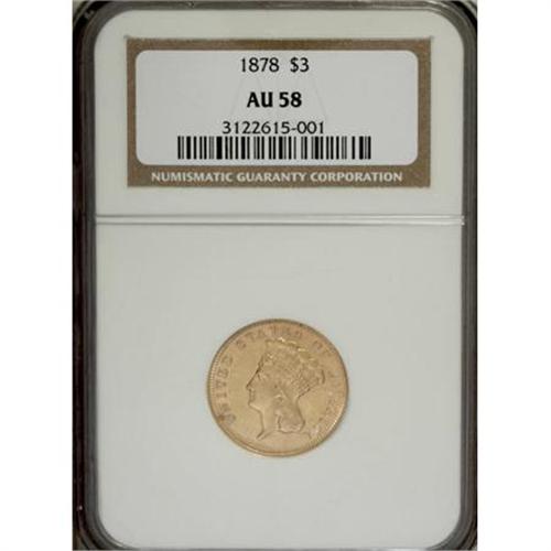<B>1878 $3 AU58 NGC.</B></I> This subtly lustrous near-Mint coin shows just a touch of rub at Liberty's brow and the ears of corn in the wreath. Well struck overall, though softness is noted at the bow.<BR><BR><B>Coin Engraver:</B> James B. Longacre<BR><BR><b>Shipping:</b> Coins & Currency (<a target="_blank" href="http://www.heritageauctions.com/common/shipping.php">view shipping information</a>)