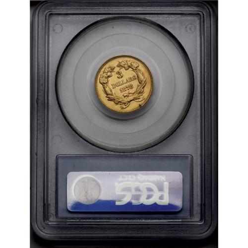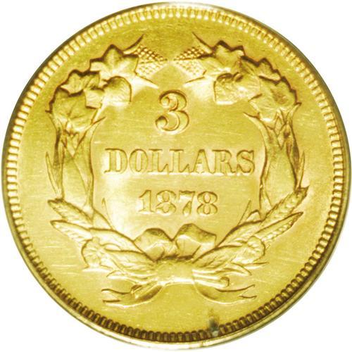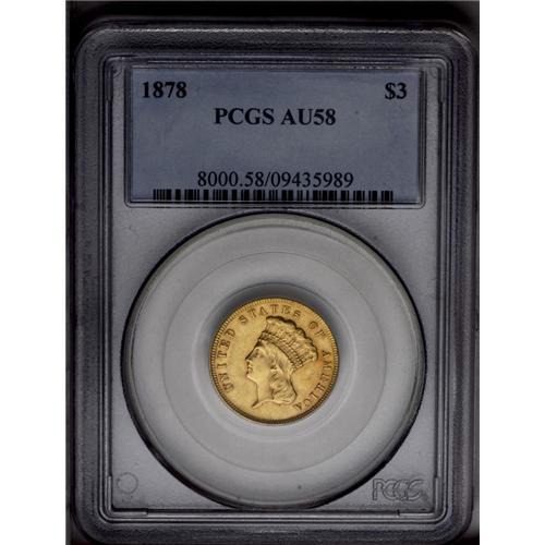 <B>1878<$3> AU58 PCGS.</B></I> A partly lustrous golden-brown piece. Smooth aside from two inconspicuous pinscratches on the left obverse field. Struck from moderately rotated dies.